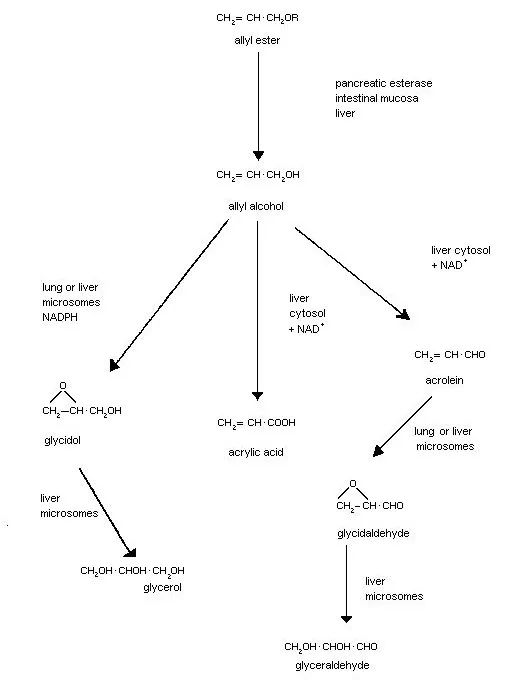 人工胃液(t´=1120 min)能使己酸烯丙酯水解缓慢,而模拟胰液(t´=1,98 min)能使己酸烯丙酯水解更快。体外大鼠小肠黏膜制剂(t´=0,096 秒)和肝脏匀浆(t´=3,96秒)也能非常迅速地水解该化合物。类似地,据报道,在孵育液中浓度为60µL/L时,己酸烯丙酯可以在2小时内被胰酶完全水解。肝匀浆在体外水解异戊酸烯丙基酯的速度比直链酸烯丙基酯慢,许多烯丙基酯的肝毒性与水解成烯丙醇的速度有关(另见短期研究)。水解后,释放出来的烯丙醇通过两种不同的氧化途径进行代谢,生成丙烯醛或环氧化合物甘油醇,如图1所示。环氧化物然后可由环氧化物水解酶转化为甘油。烯丙醇转化为丙烯醛是由乙醇脱氢酶(ADH)介导的,这一步骤在ADH缺乏的大鼠肺、基因缺陷的鹿鼠肝脏或ADH抑制剂中被阻断。然后,丙烯醛可以被肝胞浆或微粒体中依赖NAD或NADP的酶进一步氧化成丙烯酸,或被微粒体酶进一步氧化成甘油醛,然后再被环氧化物水解酶转化成甘油醛。或者,丙烯醛可以直接与谷胱甘肽或其他低分子量硫醇化合物发生酶和非酶反应,形成稳定的加合物。甘油醇和甘油醛都是肺和肝胞质谷胱甘肽- s -转移酶的底物。当大鼠服用弱酸烯丙酯时,在尿液和胆汁中检测到3-羟丙基巯基酸是谷胱甘肽衍生的代谢物。相同的代谢物被确认与烯丙醇或丙烯醛和剂量后,相比之下的比例转换后口服这些化合物或烯丙酯弱酸,可能得出的结论是,烯丙醇的酯完全水解,大部分烯丙醇转化为丙烯醛。[1] fun88乐天堂官网是什么。