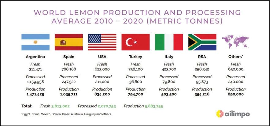 柠檬在世界上许多国家都有生产,一些柠檬生产大国,尤其是中国和印度,柠檬油的产量可以忽略不计,柠檬油的生产主要由阿根廷,西班牙,意大利,美国和南非主导,阿根廷和西班牙主导着全球产量,约占全球产量的70%,美国,土耳其和意大利也是重要的柠檬种植国,目前,这六个国家(如下图所示)的柠檬产量约占世界柠檬产量的84%,智利,墨西哥和巴西的产量较小,中国,印度,乌拉圭,玻利维亚,摩洛哥,希腊,以色列和葡萄牙也有柠檬林,柠檬通常生长在白天炎热,夜晚凉爽和雨季的地中海气候,产自沿海地区的柠檬通常比产自沙漠地区的好 fun88乐天堂官网,每年的生产和加工可能会有很大的变化,主要是由于气候因素,包括霜冻,干旱,暴雨和飓风。